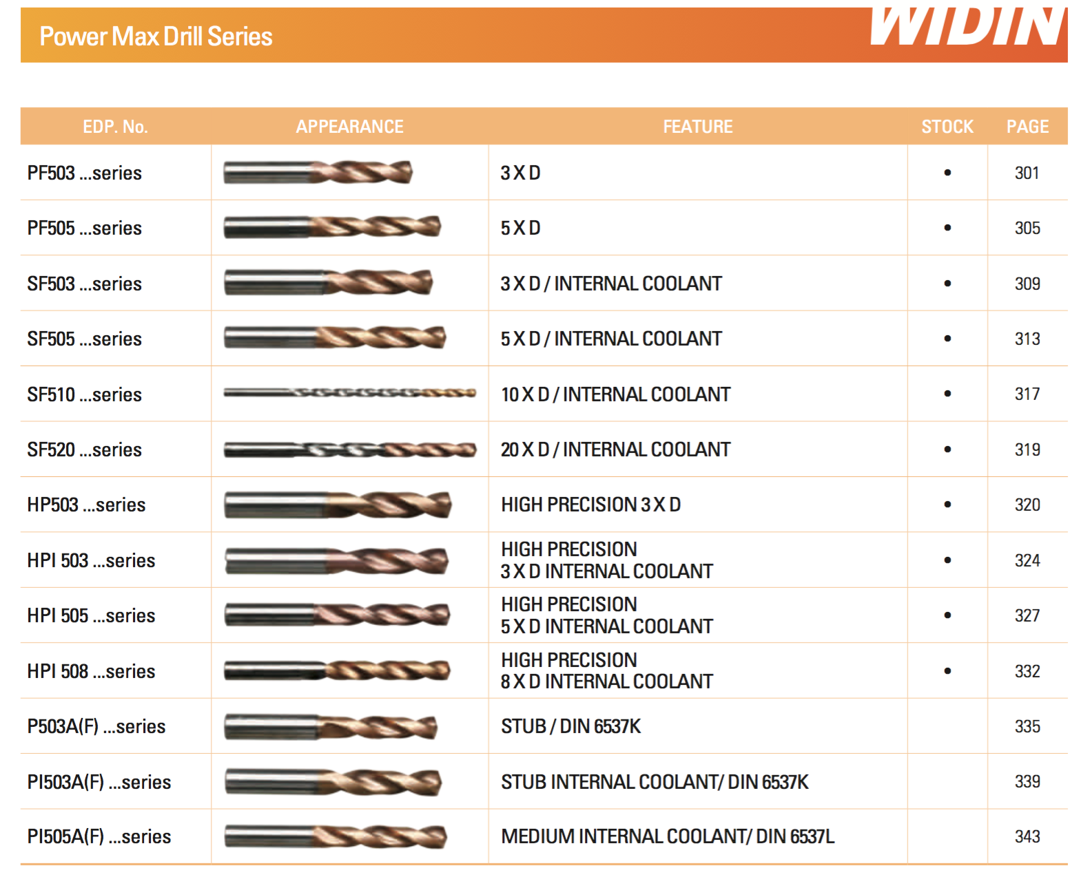 Dòng Power Max Drill Series là dòng mũi khoan cao cấp nhất của Widin, dành cho khoan các vật liệu như SUS, Gang và các vật liệu có độ cứng cao. Cho phép gia công ở tốc độ cao. Với các mũi khoan có lỗ tưới nguội trong, ứng dụng trong khoan các lỗ sâu.